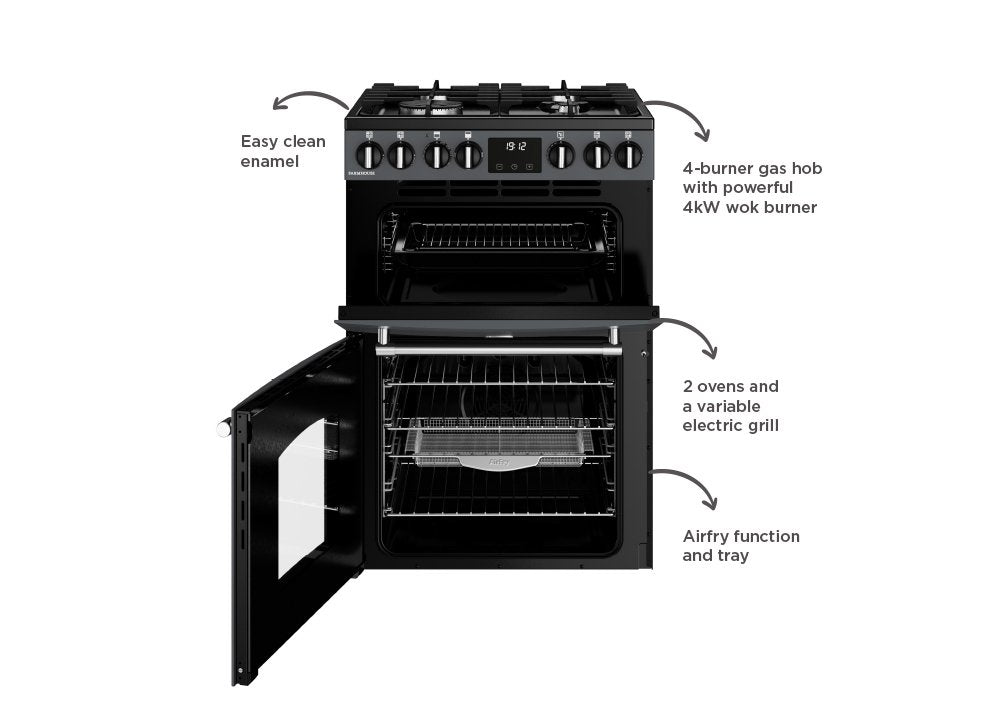 Enjoy the classic Farmhouse-style range cooker, without needing a Farmhouse-sized space. Crafted to fit seamlessly into your lifestyle and your kitchen, this mini Belling range cooker packs everything you need into a compact 60cm model – including two ovens with a range of clever functions including AirFry, a variable electric grill with a full width pan, 4 burner gas hob with a 4K wok burner, plus Easy-Clean enamel to take the elbow grease out of cleaning. All this in a timeless farmhouse range cooker design from a brand with over 100 years of heritage and expertise.