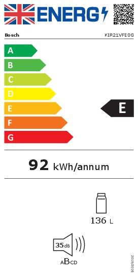 Built-in fridge easy Installation Fixed hinge, softClosing door: No Performance and Consumption EU19_EEK_D: E Total Volume : 136 l Net Fridge Volume : 136 l Annual Energy Consumption: 92 kWh/a...