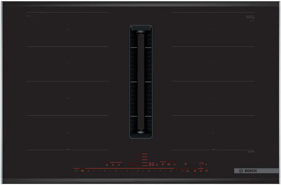The integrated ventilation module combines the best of our induction cooktops and cooker hoods. Because it is built into the cooktop surface, it draws away cooking smells and steam right where they start. This way, you don’t need a separate hood, and you have more overhead space for cabinets – or a clear view across your kitchen.
