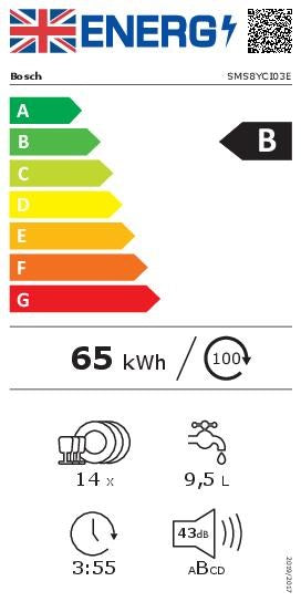 Performance Energy Efficiency Class¹: B Energy² / Water³: 65 kWh / 9.5 litres Capacity: 14 place settings Programme duration⁴: 3:55 (h:min) Noise level: 43 dB(A) re 1 pW Noise Efficiency...