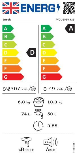 Silver EditionPerformance Energy Efficiency Class Wash and Dry¹: D Energy Efficiency Class Washing²: A Energy³ / Water⁴ Wash and Dry: 307 kWh / 74 litres Energy⁵ / Water⁶ Washing: 49...