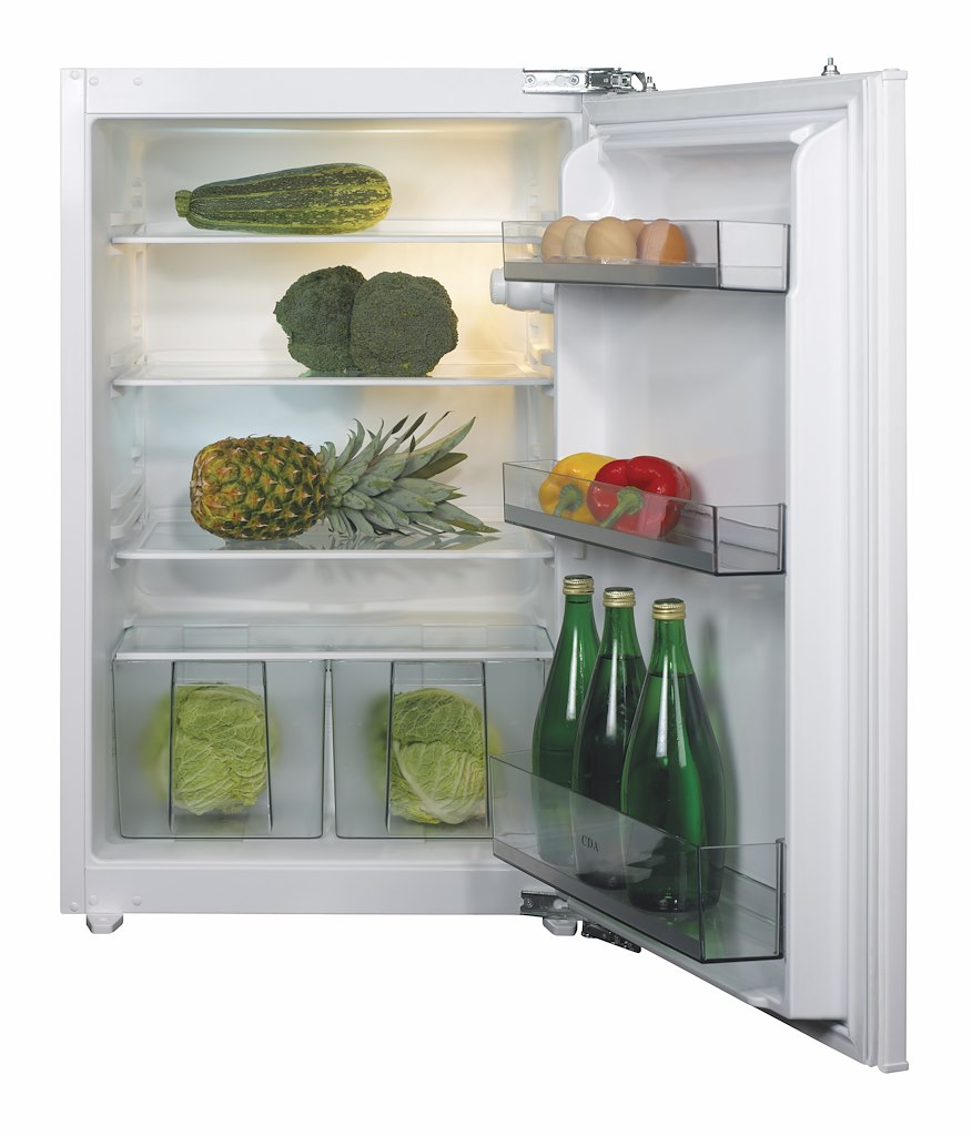 white CDA Integrated in-column larder fridge. This F energy rated appliance has a refrigeration capacity of 134 litres. The CDA FW422 has 4 shelves with adjustable shelving for maximising your storage space as well as vegetable storage drawer for keeping produce fresh and cool; drinks storage; egg tray and dairy storage compartment for optimum preservation of cheese and milk products. When installing this appliance the CDA Integrated Undercounter has dimensions of 54cm (width) x 87.5cm (height) x 54.5cm (depth) as well as reversible door configuration to ensure the fridge fits your kitchen conveniently and a noise level of 41dB ensuring quiet operation throughout its life cycle. CDA provides you with a manufacturer's warranty of 5 years for added peace of mind on your new refrigerator.