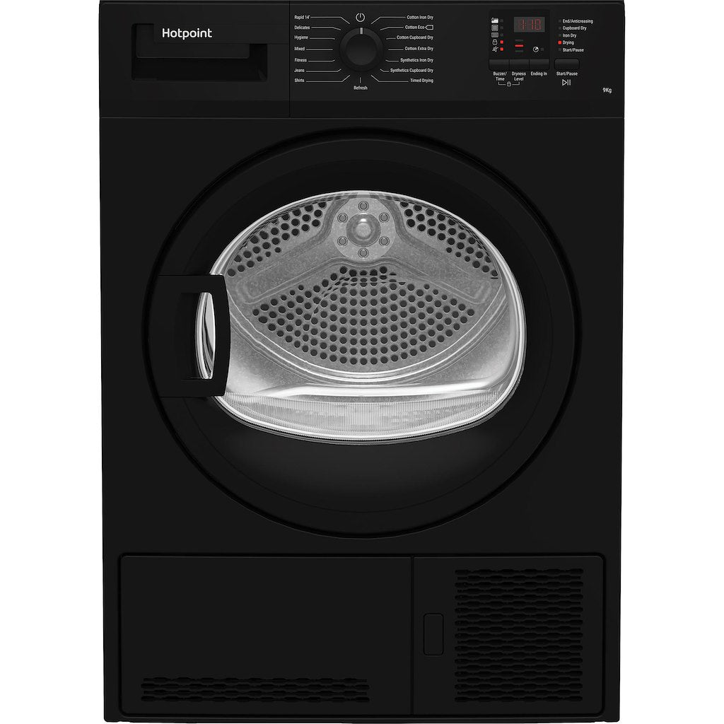 Hotpoint 9KG Condenser Dryer in Black, Energy Rating B. Features a digital time display and a single dial for easy selection of 15 drying cycles, including a quick 14-minute rapid cycle, refresh cycle and timed drying options. Comes with a transparent door for easy monitoring.