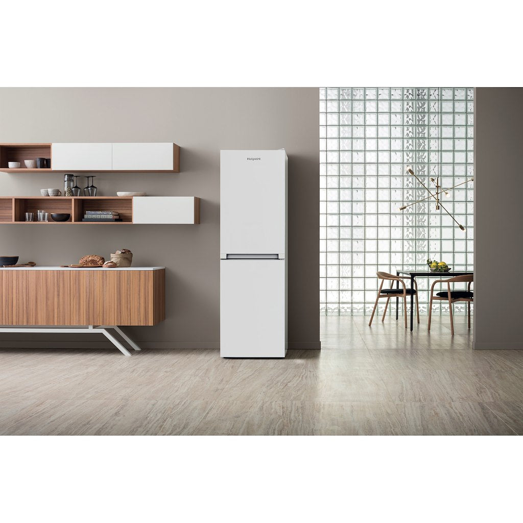 This Hotpoint freestanding Fridge Freezer features: a tall appliance to fit your family needs. White colour. No frost, frost free technology, that effectively prevents ice build-up in your appliance, by reducing humidity levels. Glass shelves with profile fronts, providing robustness and extra safety. Convenient bottle balcony to safely store your bottles.