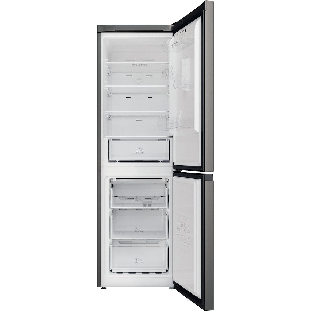 You can count on the Hotpoint freestanding H5X 82O SK fridge freezer in silver black, which takes care of your fresh and frozen food. Our Total No Frost technology circulates the air to prevent any ice build up which means you never have to defrost your fridge freezer again avoiding soggy salads. The Active Fresh function helps you to prevent food waste by ensuring the ideal temperature levels for longer food preservation by quickly restoring the fridge to the optimum temperature after opening and closing it. This model also features a dedicated Fresh Zone drawer that takes care of your salads and ensures long lasting freshness of your vegetables.