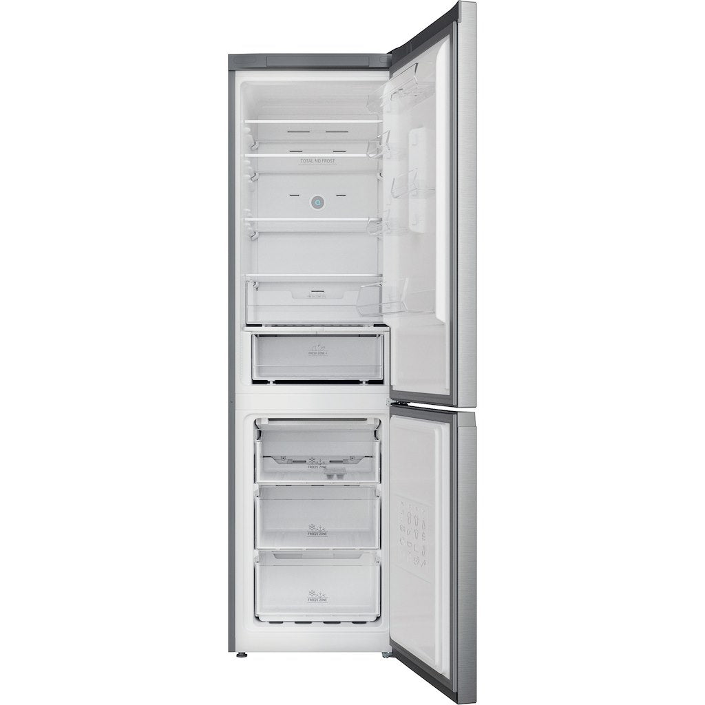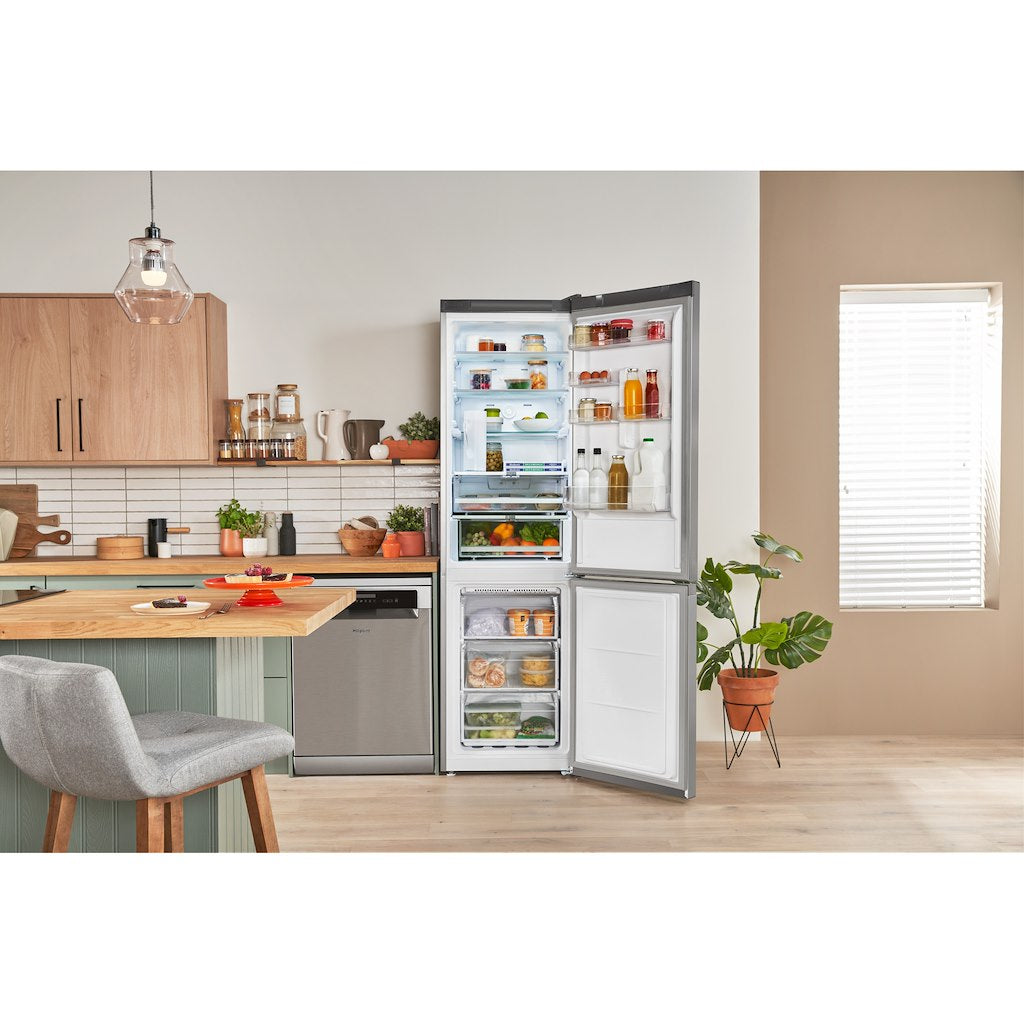 The Hotpoint freestanding H7X 93T SX fridge freezer in satin stainless steel is packed with thoughtful technology that makes your life easier, save you money and takes care of your fresh and frozen food. Our Total No Frost technology constantly circulates air, preventing ice and moisture build up in both the fridge and freezer, so you never have to defrost your appliance again. With Active Oxygen, bacteria and viruses are reduced by up to 99% creating the right environment for your fresh foods and keeps bad odours at bay. The Active Fresh function helps you to prevent food waste by ensuring the ideal temperature levels for longer food preservation. This Hotpoint model comes with the Fresh Zone 0°C, a dedicated area for your meat and fish, designed to create a healthy space to care for your delicate foods..