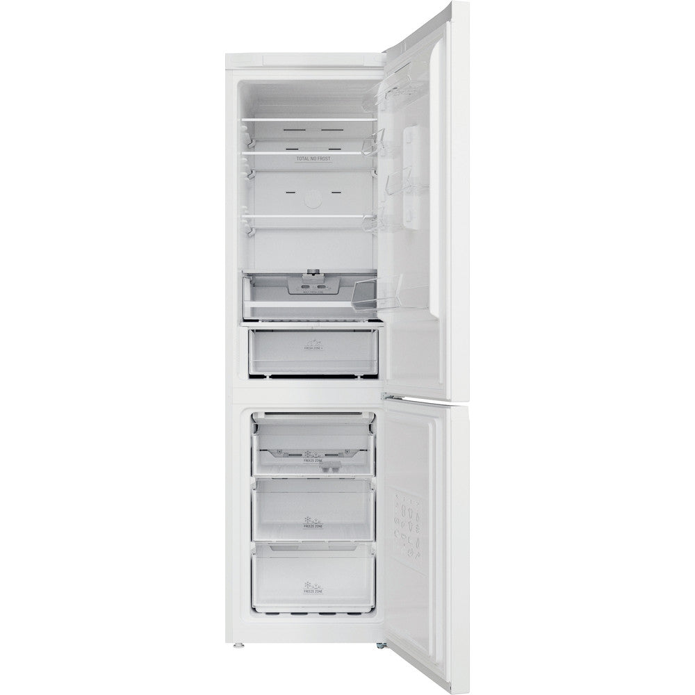 This Hotpoint freestanding Fridge Freezer features: a tall appliance to fit your family needs. White colour. No frost, frost free technology, that effectively prevents ice build-up in your appliance, by reducing humidity levels. Glass shelves, providing robustness. Convenient bottle balcony to safely store your bottles.