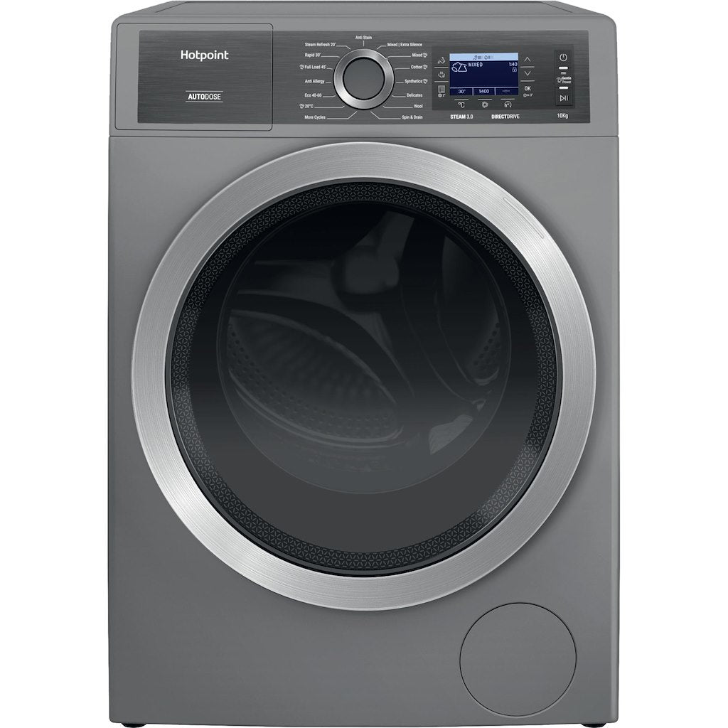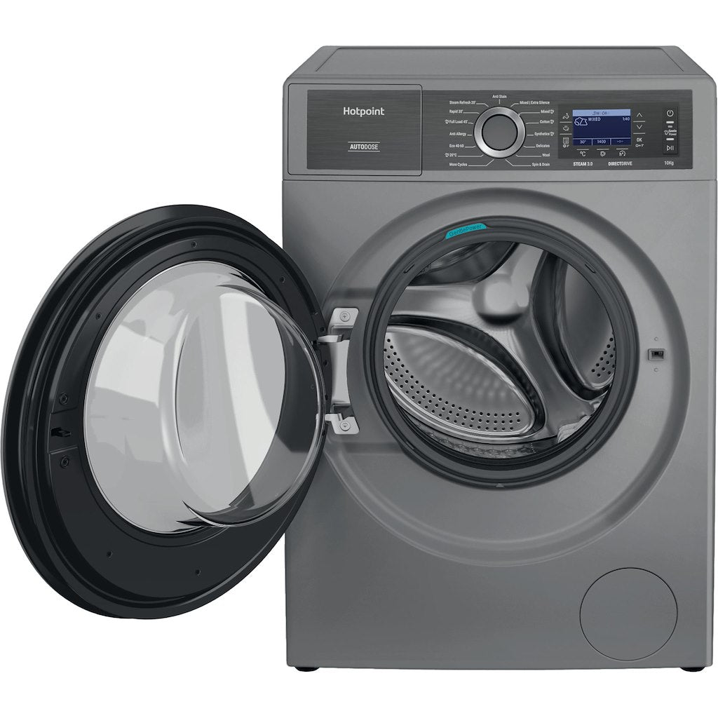 Achieve impeccable cleaning with maximum energy and water efficiency. This Hotpoint GentlePower washing machine in silver has a generous 10kg capacity for even the biggest households and a 1400 revolutions per minute spin speed.