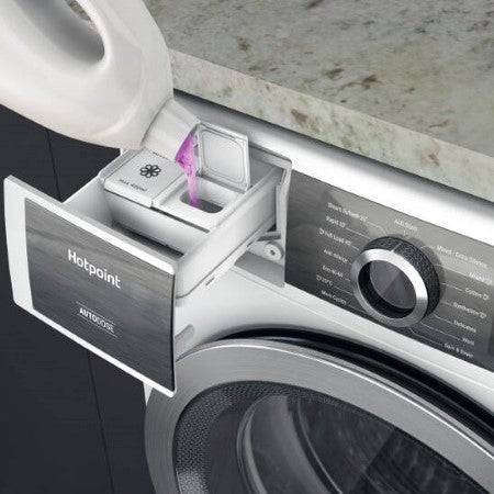 Achieve impeccable cleaning with maximum energy and water efficiency. The Hotpoint H8 W946WB UK 9kg washing machine boasts an authentic design and a large drum capacity. GentlePower technology delivers a high standard of cleaning performance whilst saving 65% energy and 59% of water*. GentlePower technology carefully sprays water onto your laundry like a waterfall, providing a thorough wash, whilst Load Detect precisely understands the quantity of laundry placed inside the drum and automatically adjusts the water and energy usage. This model also features the AutoDose function, so you don't have to think about how much detergent to use for each wash. The Direct Drive motor replaces the traditional belt-driven motor that rotates the drum directly, offering quality, reliability and minimum noise levels. When all you need is silence, the extra silent cycle takes care of laundry, at any time of the day, without disturbing you. For added versatility, discover the power of steam and achieve ultimate cleaning results and peace of mind, Steam 3.0 technologies provide ultimate cleaning results with three options to choose from. The Steam Hygiene cycle reduces bacteria thanks to a prolonged high temperature; the 20-minute Steam Refresh cycle refreshes clothes without washing; and finally, the Steam Finish option keeps your laundry soft and crease-free, for up to 6 hours after the end of the cycle.