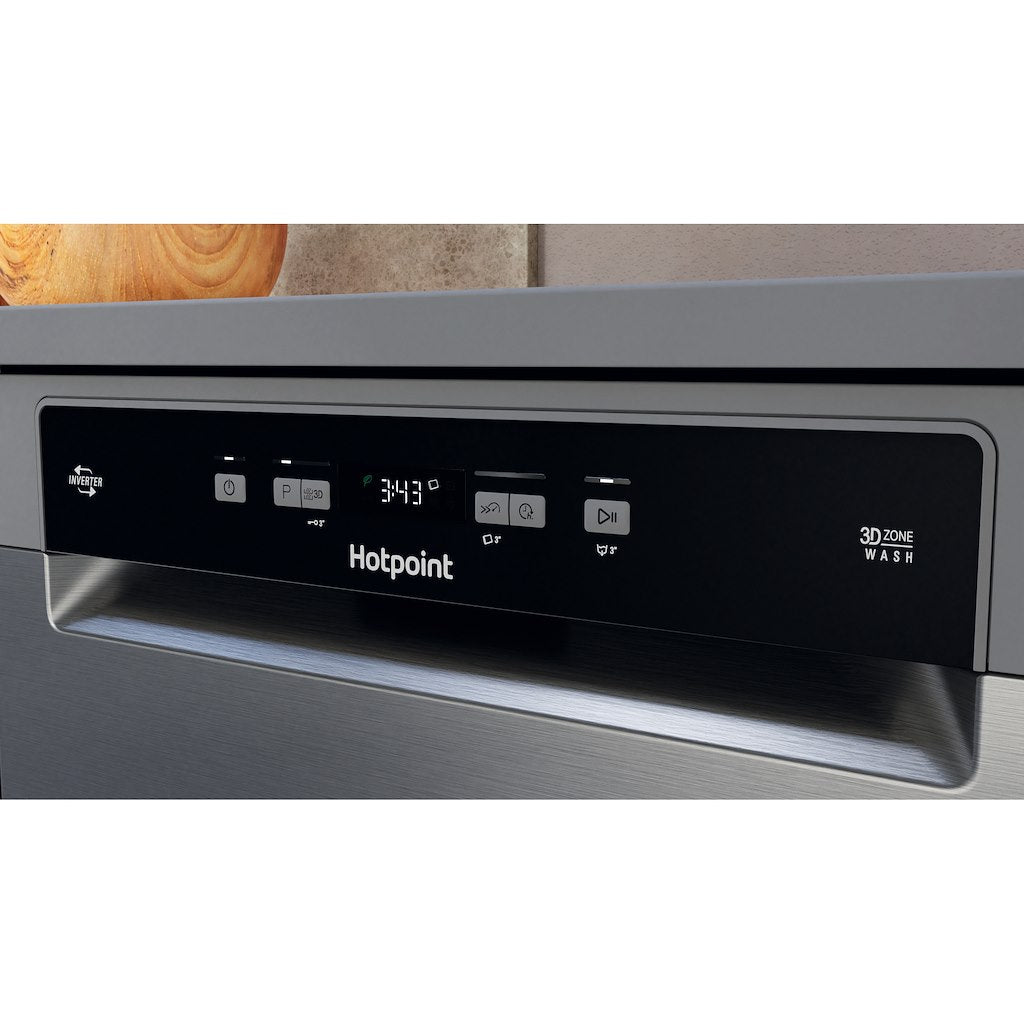 The Hotpoint HFC 3C26 WC X UK freestanding full size dishwasher is designed to remove stubborn, baked-on food, quietly, so you can trust it to leave your tableware sparkling clean. 3D Zone Wash provides deep clean with 40% more cleaning power, or you can also choose 40% more energy efficiency if you’d prefer*. With Active Dry, which automatically opens the door at the end of each cycle, you can save on energy and achieve 60% better drying results**. Our Adjustable baskets give you maximum flexibility when loading, so there’s plenty of space for all your crockery. Elegantly designed, this freestanding dishwasher will suit any kitchen layout with its stainless steel finish.