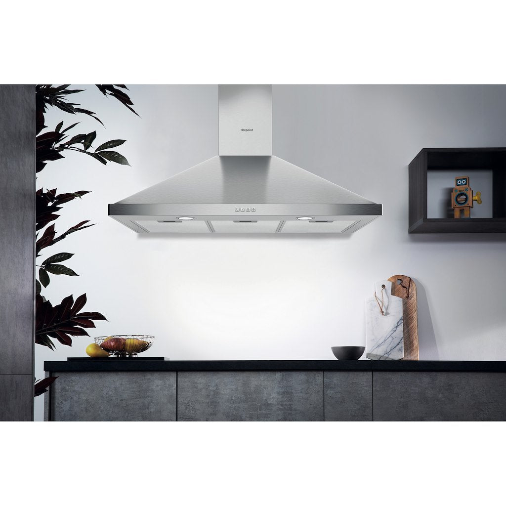This Hotpoint wall mounted Cooker Hood features: between 60cm and 90cm wide appliance. An outstanding cooker extractor fan, ensuring a fresh, grease-free cooking environment. New design ensuring extra silent performance. LED lights for ideal lighting. Dishwasher-safe, washable aluminium grease filters.