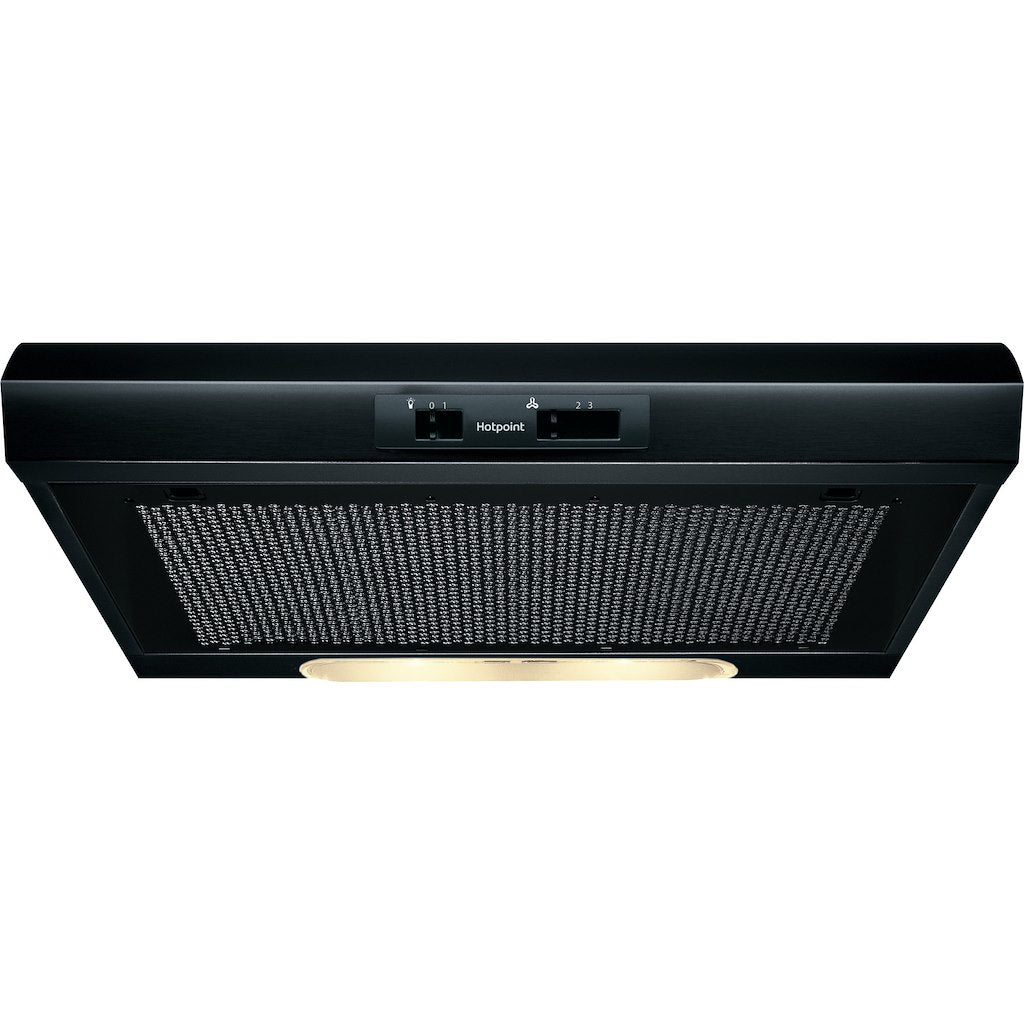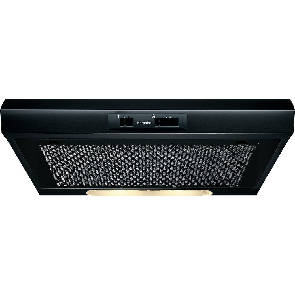 This Hotpoint integrated Cooker Hood is less than 60cm wide appliance An outstanding cooker extractor fan, ensuring a fresh, grease-free cooking environment. New design ensuring extra silent performance. LED lights for ideal lighting. Dishwasher-safe, washable aluminium grease filters.