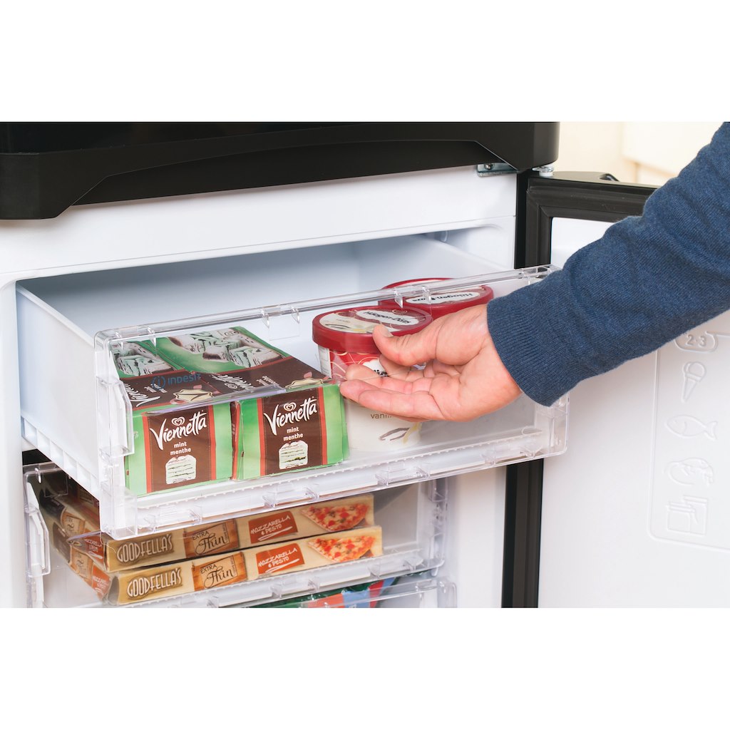 This Indesit freestanding Fridge Freezer features: black colour. Glass shelves with profile fronts, providing robustness and extra safety. Convenient bottle balcony to safely store your bottles.