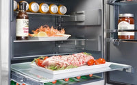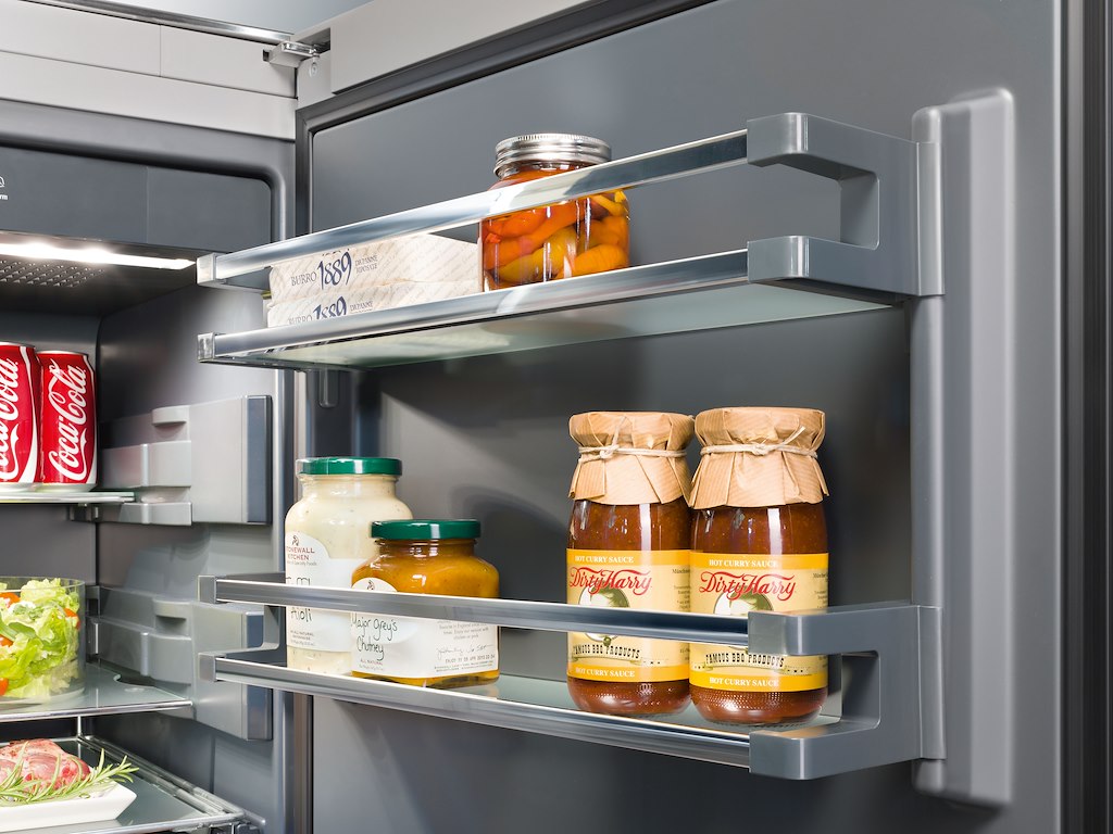 With bottles stored at the bottom, the two storage racks are ideal for smaller packages. The glass shelf on telescopic rails provides an overview of foodstuffs stored at the back. Depending on the size, containers can also be stored on two height-adjustable glass shelves. And a separable glass shelf means that larger and open bottles can easily be stored upright.