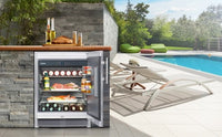 Outdoor kitchens with refrigerators – whether free-standing or built-in – also provide convenience and perfect storage outdoors. The Outdoor Cooler is ideally suited to outdoor use thanks to its rust- and weatherproof materials, robust construction and high-quality components as well as its automatic shut-down function and integrated lock.