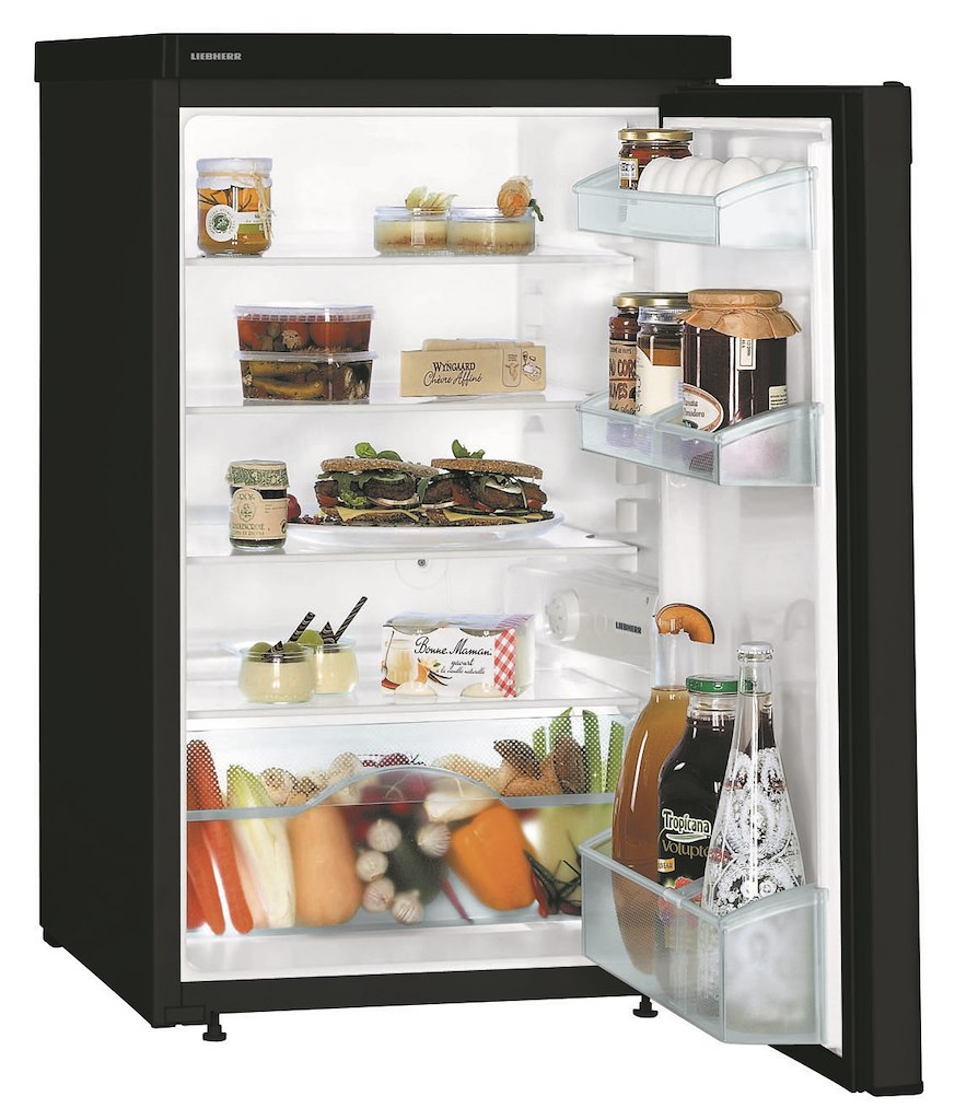 Black Liebherr Tb1400 Under counter fridge. The Liebherr Tb1400 has 4 shelves with adjustable shelving for maximising your storage space as well as vegetable storage drawer for keeping produce fresh and cool; drinks storage; egg tray and dairy storage compartment for optimum preservation of cheese and milk products. When installing this appliance the Liebherr Under counter has dimensions of 50cm (width) x 85cm (height) x 62cm (depth) as well as reversible door configuration to ensure the fridge fits your kitchen conveniently. Liebherr provides you with a manufacturer's warranty of 2 years for added peace of mind on your new refrigerator.