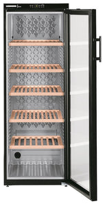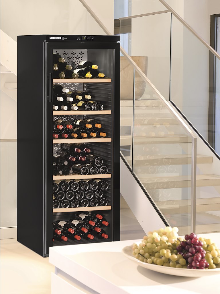 Liebherr free-standing WKb4212 wine cabinet has install dimensions of 60cm (width) x 165cm (height) x 74cm (depth). This WKb4212 model has 200 bottles capacity, reversible Glass door, Black finish, Modern...