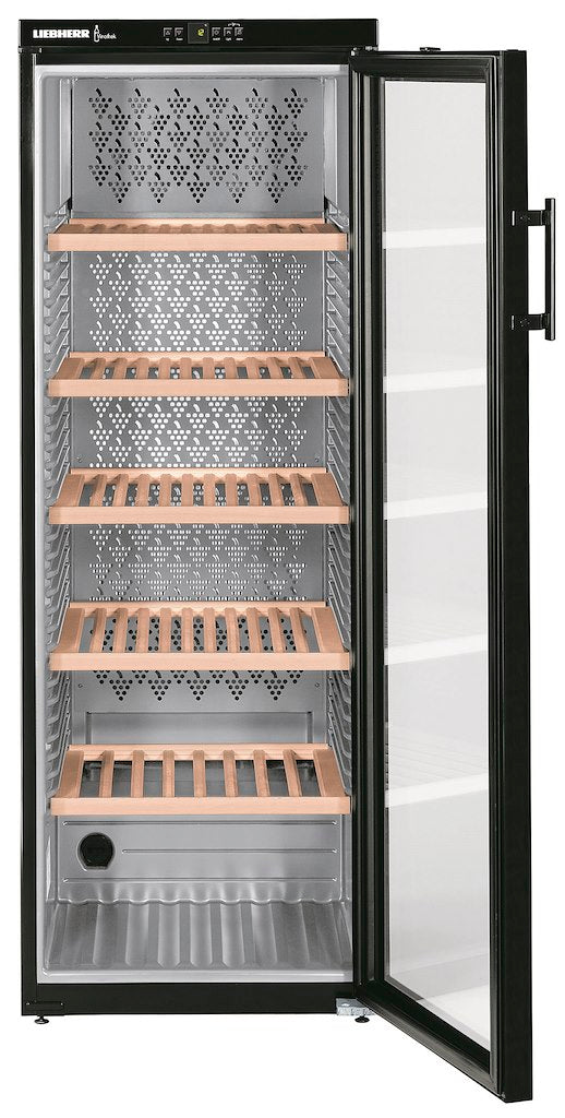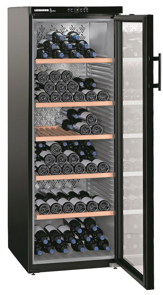 Liebherr free-standing WKb4212 wine cabinet has install dimensions of 60cm (width) x 165cm (height) x 74cm (depth). This WKb4212 model has 200 bottles capacity, reversible Glass door, Black finish, Modern design, controllable temperature Range and a manufacturer's warranty of 2 years for peace of mind.