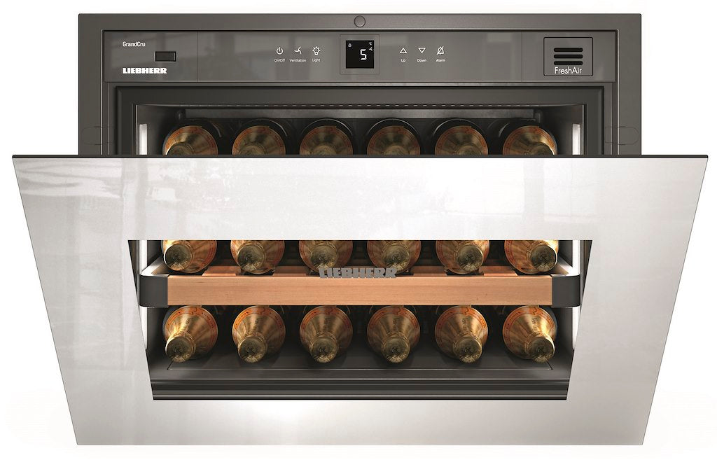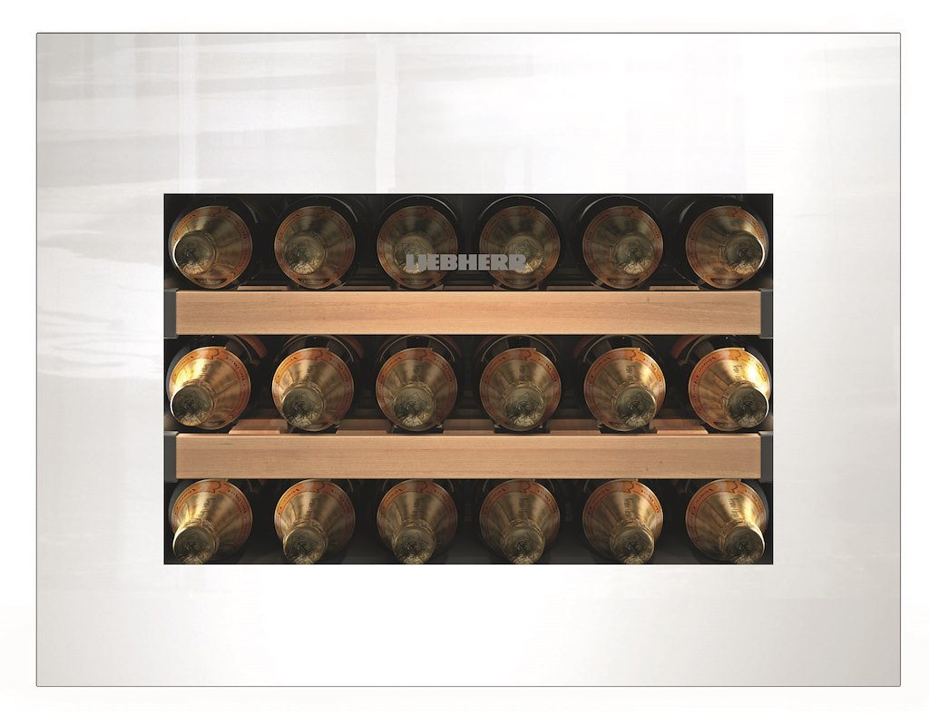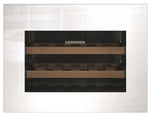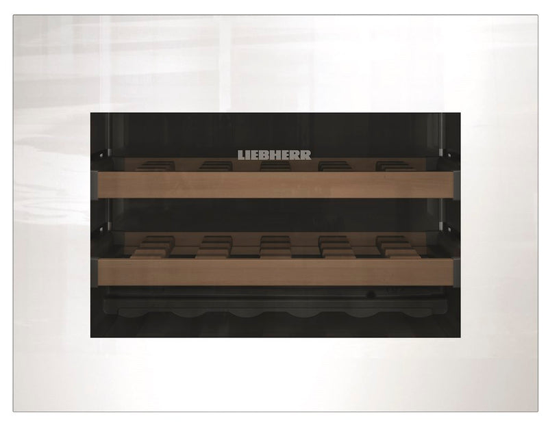 White glass Liebherr built-in WKEgb582 wine cabinet has install dimensions of 56cm (width) x 45cm (height) x 55cm (depth). This WKEgb582 model has 18 bottles capacity, humidity control, vertical opening handle-less door, white glass finish, wooden shelving, door alarm and a manufacturer's warranty of 2 years for peace of mind.
