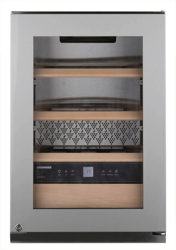 stainless Steel Liebherr free-standing WKes653. Liebherr wine cabinet has install dimensions of 43cm (width) x 61cm (height) x 48cm (depth). This WKes653 model has 12 bottles capacity, wooden shelving, isolated temperature, stainless finish, Glass door, Metal door Handle and a manufacturer's warranty of 2 years for peace of mind.