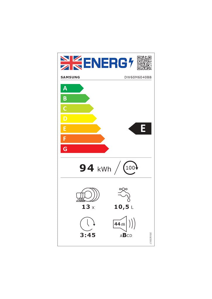 Stainless Steel Samsung Built-in Dishwasher DW60M6040BB/EU.This E energy rated model comes equipped with 13 place settings; 5 washing modes and 6 temperature options for the most effective cleaning of your glasses; plates and kitchen wear. This Samsung dishwasher has install dimensions of 59.8cm (width) x 84.5cm (height) x 60cm (depth) and an operating noise level of 44dB. The DW60M6040BB/EU model also comes with delay timer; adjustable plinth; delicate program for fragile glasses and plates; half load function for lower water usage and power consumption and a manufacturer's warranty of 2 years for peace of mind.