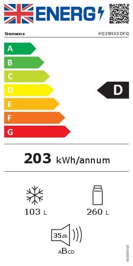 Performance and Consumption EU19_EEK_D: D Total Volume : 363 l Net Fridge Volume : 260 l Net Freezer Volume : 103 l Freezing capacity 24h : 9.5 kg Annual Energy...