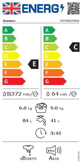 Performance Energy Efficiency Class Wash and Dry¹: E Energy Efficiency Class Washing²: C Energy³ / Water⁴ Wash and Dry: 372 kWh / 84 litres Energy⁵ / Water⁶ Washing: 64 kWh...