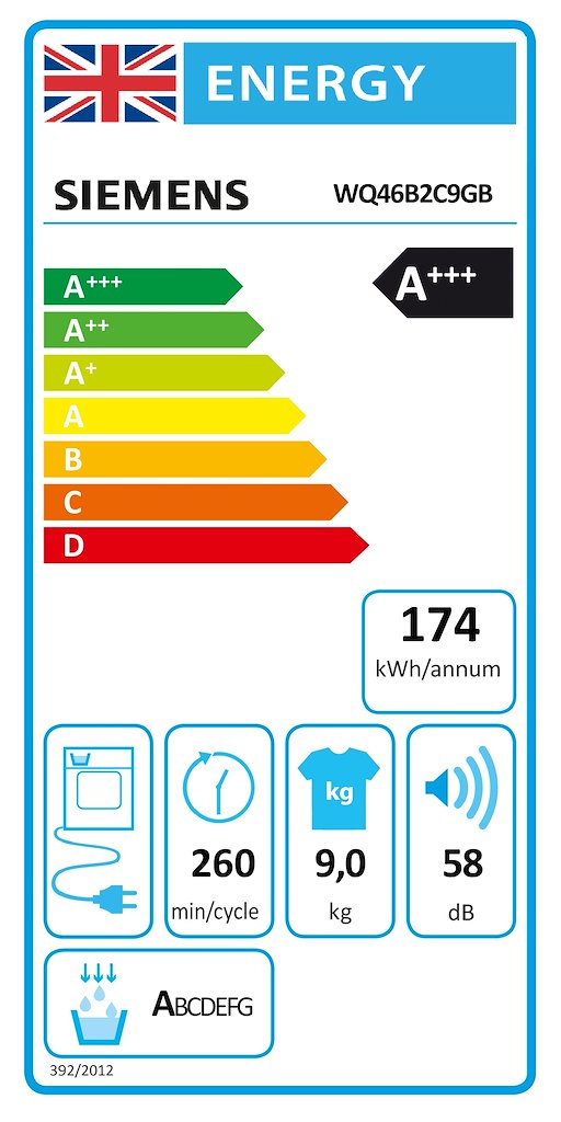Performance Energy Efficiency Class¹: A+++ 10% more efficient than energy effiency class A+++*** Energy²: 174 kWh Capacity: 1 - 9 kg Programme time³: 260 min Noise level: 58 dB (A)...