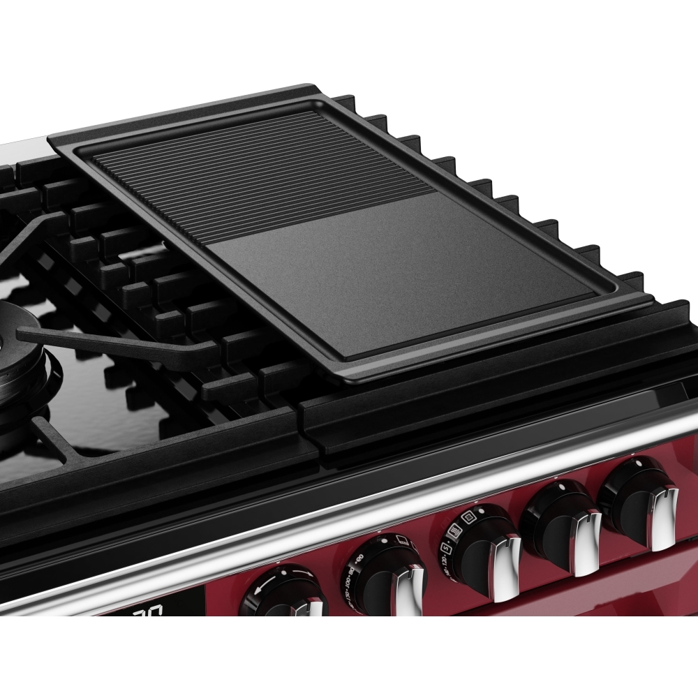 90cm Deluxe dual fuel range cooker with a 5 burner gas hob. Features include: cast iron pan supports, a 4kW PowerWok™ burner, conventional top oven & Maxi-Grill™ variable rate electric grill with telescopic sliders, 13 setting multifunction main oven with TrueTemp™ digital thermostat and rapid pre-heat. This model also includes the large capacity Titan™ twin fanned oven and the PROFLEX™ Splitter. Other features include the easy to read Maxi-Clock™ LED touch control programmer, Pro-Trac™ double-extension telescopic sliders, Steam & Infuse™ cooking accessory and cast iron griddle & wok cradle. All ovens are A rated for energy efficiency
