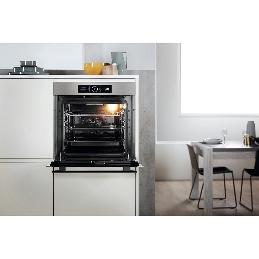 This Whirlpool built-in oven features self cleaning Pyrolytic technology so you never have to face the chore of cleaning your oven again. The oven uses a high-temperature cycle to burn food residues and splatters into ash, which can then be easily wiped away with a sponge. Let intuitive 6TH SENSE do the thinking for you, simply pick from a variety of pre-programmed recipes, and your oven will automatically adjust the cooking temperature and time to give you perfect results. There's also the handy Cook3 function, that allows you to cook up to three separate dishes at the same time, without the risk of aromas of flavours mixing.